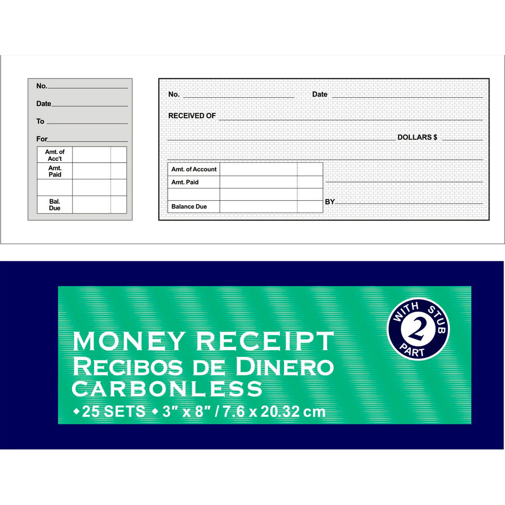 Money Receipt Book, Carbonless, 3″x 8″, 25 Sets, 50 Sheets