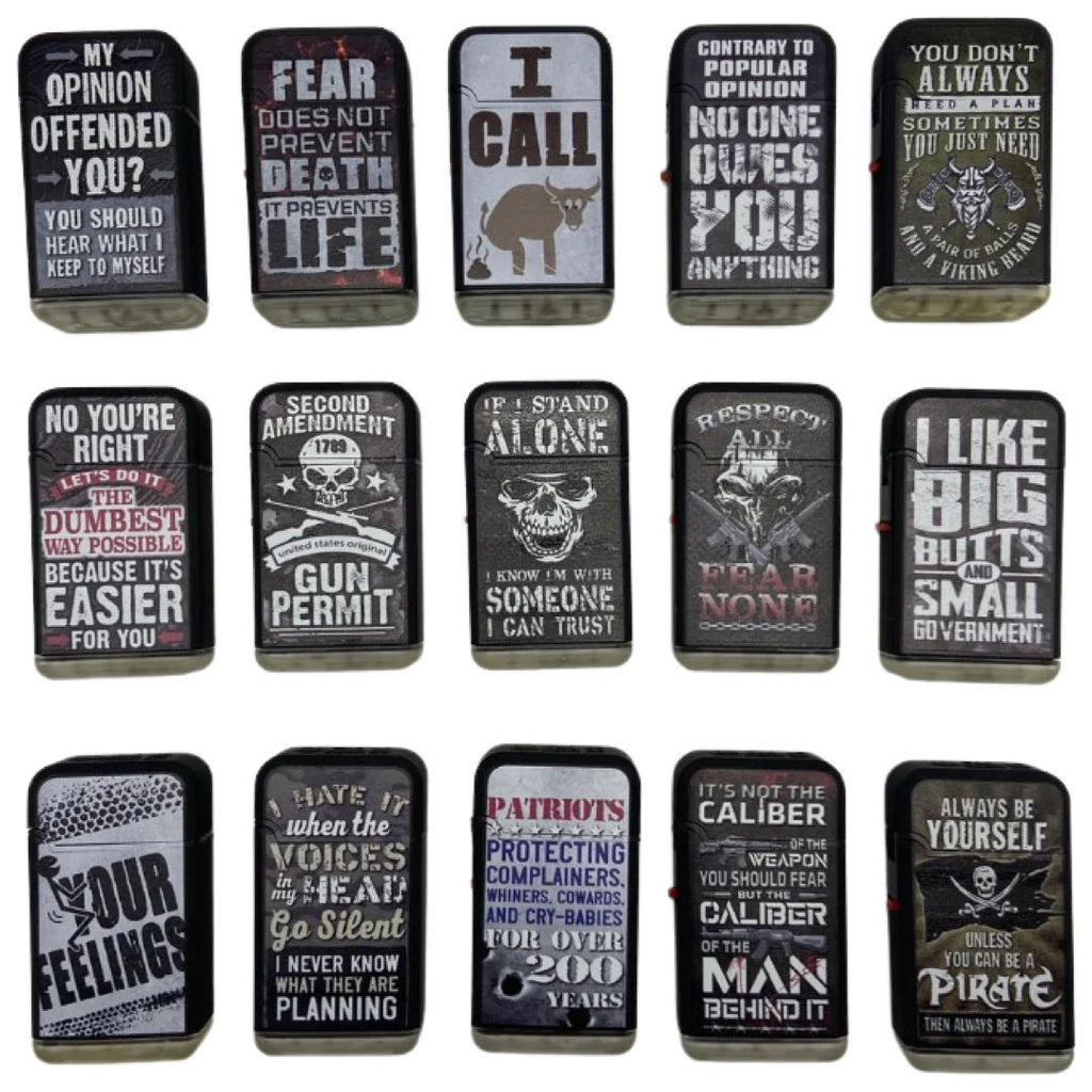 Tactical Dual Torch Lighters feature a 2300° blue flame, perfect for camping, cigars, pipes, and candles. Also has an extra large, refillable fluid chamber - you won't have to worry about this torch going out! Various unapologetic phrase styles printed on soft touch comfort casing.