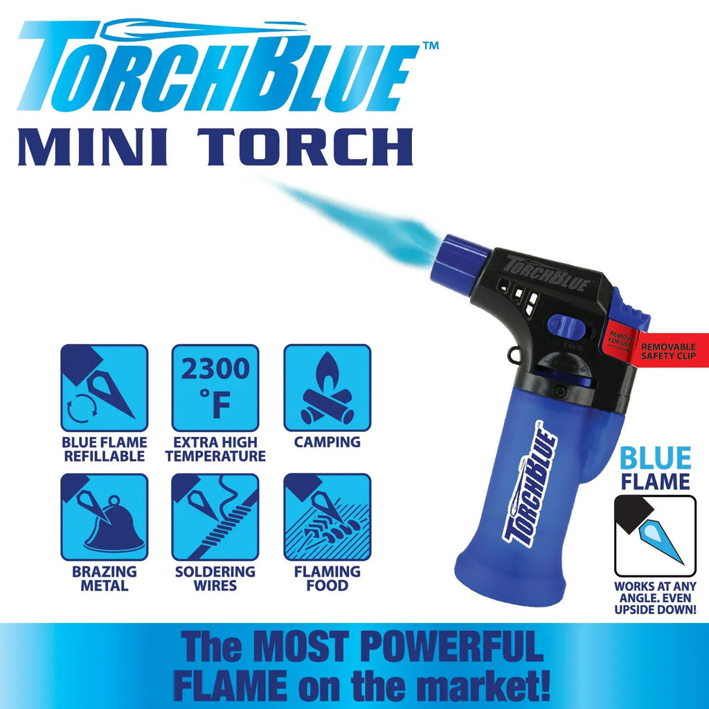 Refillable Torch Blue Mini Lighter is a powerful torch with a whopping 2300° flame, which is more than enough for any task. Great for camping, bronzing metal, soldering wires, flaming food, and more! Comes with a built-in safety lock. Works at any angle, even upside down! Comes with a soft touch finish.